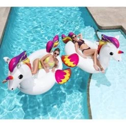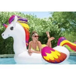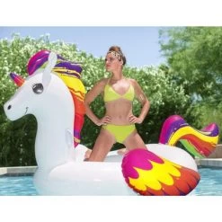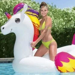 Wat een groot ding! Met deze opblaasbare reusachtige eenhoorn val je zeker op in het zwembad of aan het strand. De giga eenhoorn heeft opgeblazen afmetingen van 233x145x137, is gemaakt van sterk vinyl en uitgerust met een veiligheidsventiel. Maak het je dus maar gemakkelijk op dit XL sprookjesdier en drijf ontspannen op het water. Bang om ervan af te vallen, hoef je niet te zijn; er zitten 2 stevige handvatten aan waar je je aan kunt vasthouden.