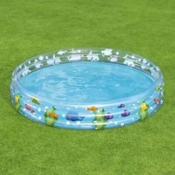 Het is gemaakt van stevig PVC met een leuke grafische print met een onderwaterthema. Het bovengrondse zwembad heeft een wand die is samengesteld uit 3 gelijke ringen en heeft een inhoud van 480 liter. Het wordt geleverd met een reparatiepatch.