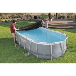 De hoes is gemaakt van hoogwaardig PVC-materiaal, waardoor hij scheur- en waterbestendig is. Dankzij de afvoergaten laat deze zwembadafdekking regenwater door, waardoor dat niet kan ophopen op het oppervlak. De hoes voor bovengrondse zwembaden kan met de meegeleverde touwen stevig aan het zwembad worden bevestigd. Dit afdekzeil is geschikt voor Power Steel ovale zwembaden met een afmeting van 427x250x100 cm.
